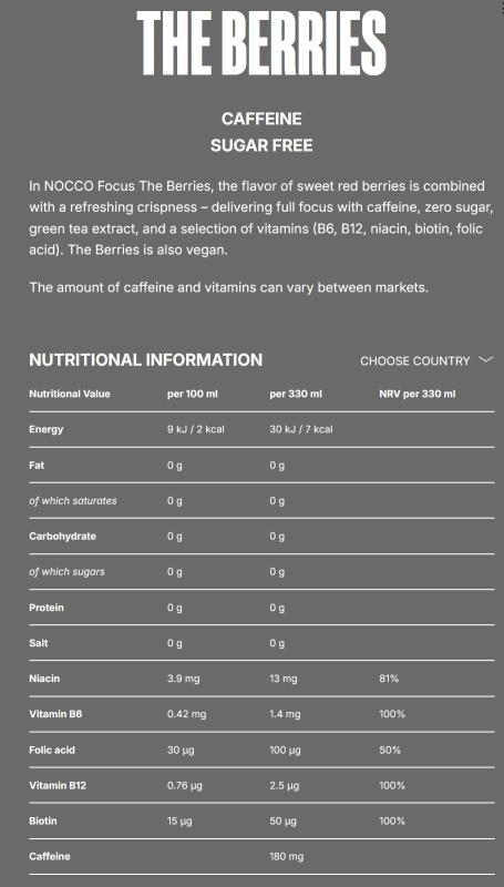 NOCCO FOCUS is carbonated, completely sugar-free and contains 180 mg of caffeine per serving. NOCCO FOCUS is perfect for studying, playing, working, or exercising! NOCCO FOCUS is the fastest, easiest and perhaps tastiest option for those who want to get an energy boost and increased focus. Each can contains 180 mg of caffeine, which contributes to increased alertness and concentration. It also contains vitamin B6, which contributes to the reduction of tiredness and fatigue, as well as normal protein and glycogen metabolism, and niacin, which contributes to normal energy metabolism.