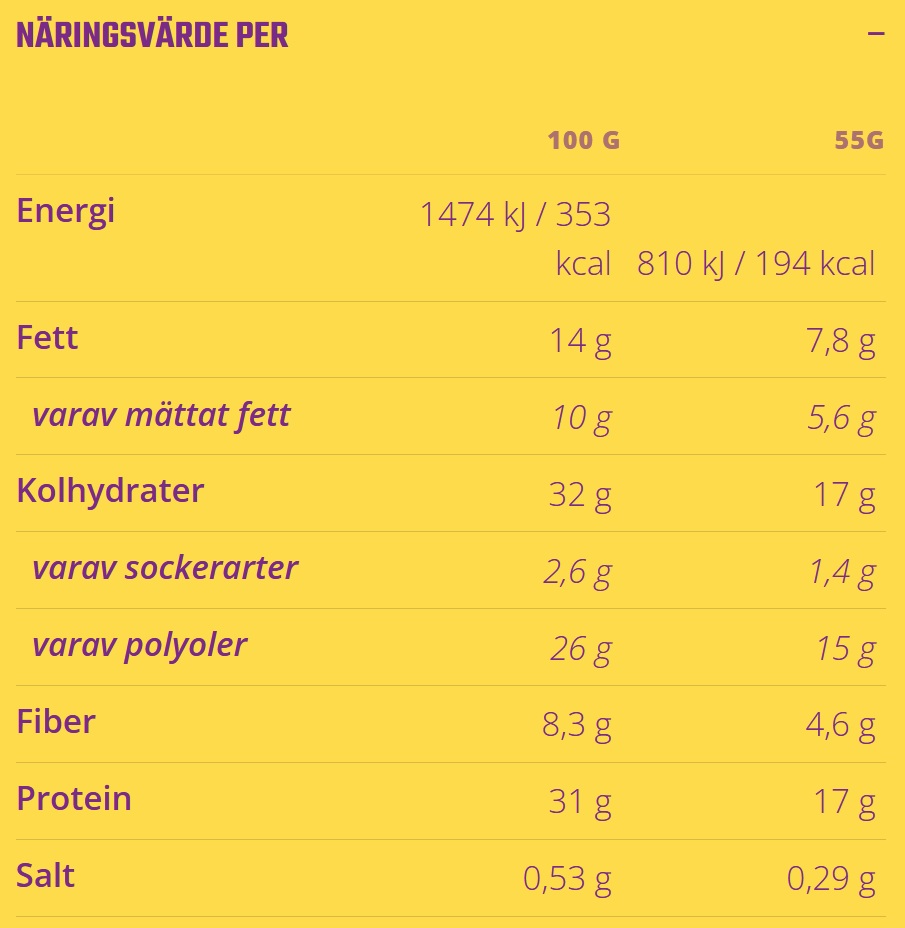 MILK PROTEIN, caramel (19%) (sweeteners: sorbitol, coconut oil, dextrin (WHEAT), humectant (glycerol), water, SKIMMED MILK POWDER, cinnamon, natural flavourings, salt, emulsifier (mono- and diglycerides of fatty acids), acidity regulator (citric acid)), sweetener (maltitol), humectant (glycerol), collagen peptides (from walnut), polydextrose syrup (bulking agent (polydextrose), water), cocoa butter, ALMOND PROTEIN, SKIMMED MILK POWDER, cocoa mass, anhydrous MILK FAT, salt, flavourings (MILK), emulsifier (SOYA LECITHIN), sweeteners (aspartame, acesulfame K). Contains a source of phenylalanine. Contains naturally occurring sugars. May contain traces of CASHEW NUTS, HAZELNUTS and EGGS. Contains polyols. Excessive consumption may have a laxative effect.