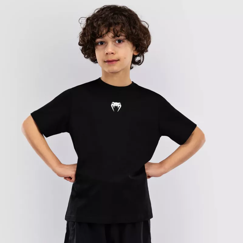 The Venum Contender Kids Classic T-Shirt in Black is a classic short-sleeve crewneck tee that puts the Venum logo front and center. Made with light, comfortable cotton, this will be your child’s new favorite T-shirt. Pair it with Venum Kids sweatpants or shorts.