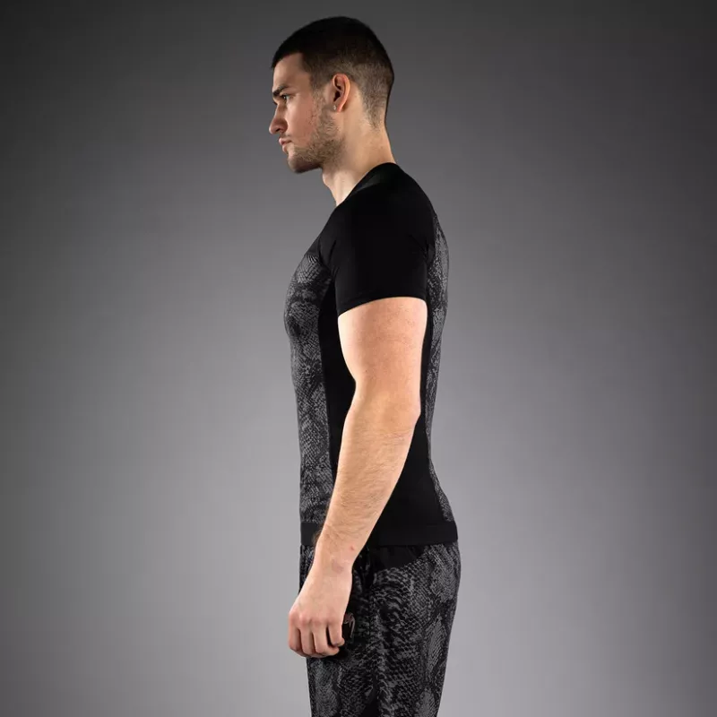 The Venum G-Fit Scales Men’s Short Sleeve Rashguard serves as a second skin, offering protection from scrapes and burns during grappling.