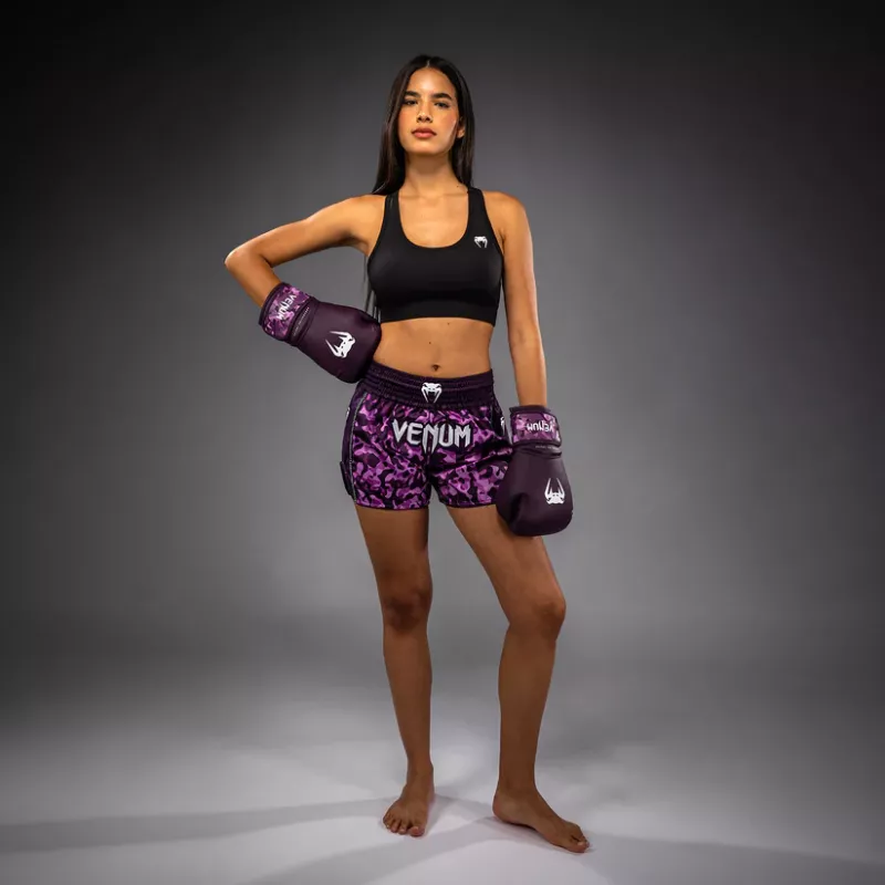The Venum Iris range includes boxing gloves, boxing shoes and Muay Thai shorts. The Venum Iris Muay Thai Shorts are lightweight and flexible with slits at the sides for freedom of movement in the ring. You'll love to train and compete in these women's Muay Thai shorts. A traditional wide elasticate waistband provides support as training heats up. The plum-purple design is stunning paired with the matching boxing gloves.