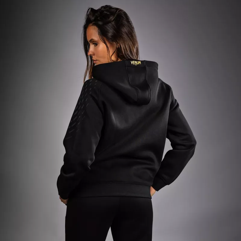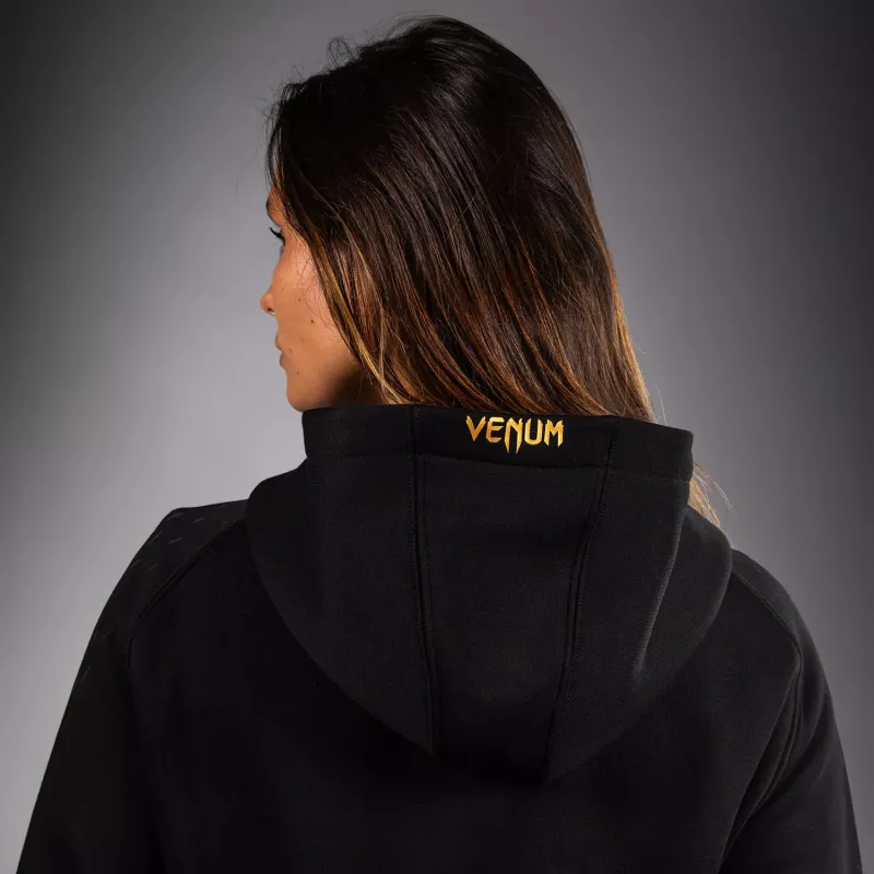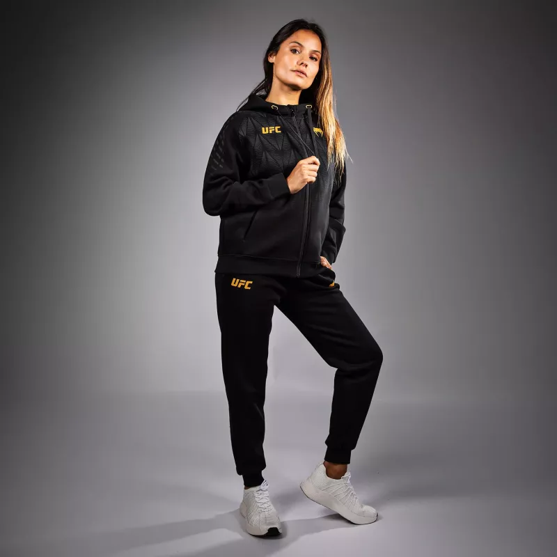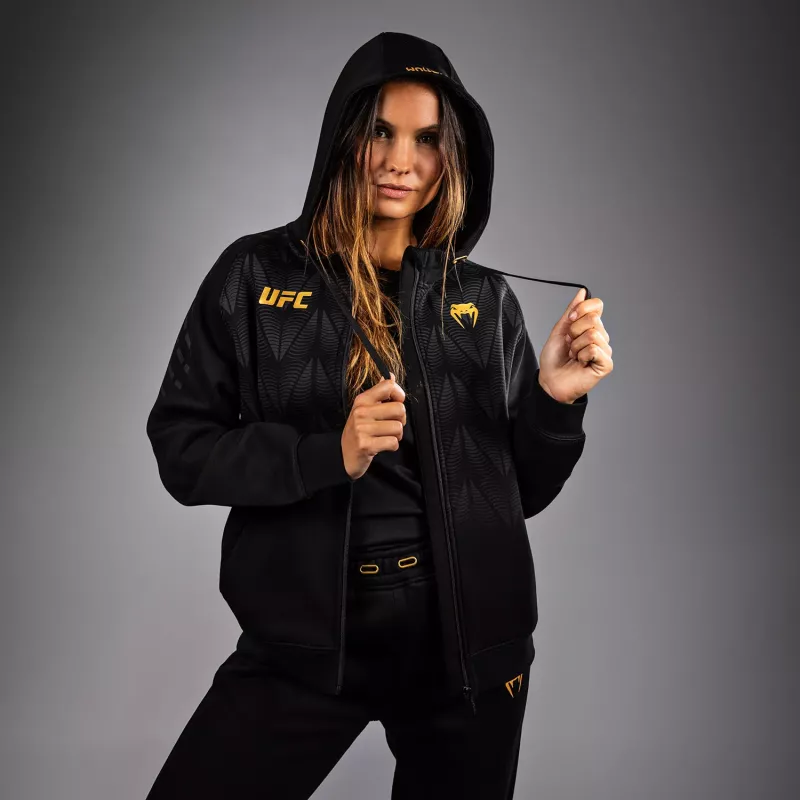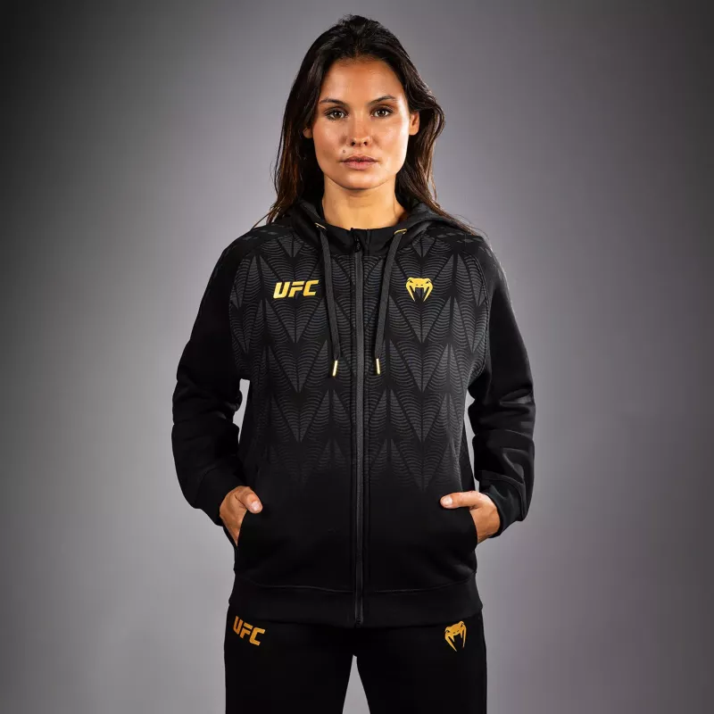 The UFC Zenith by Venum Replica Women’s Zip Hoodie features open side pockets and a drawstring hood. Venum and UFC logo detailing sit at the chest and hood. This black/gold colorway is reserved for UFC champions.
