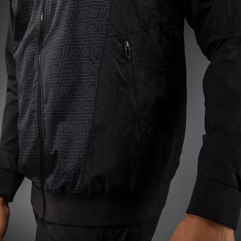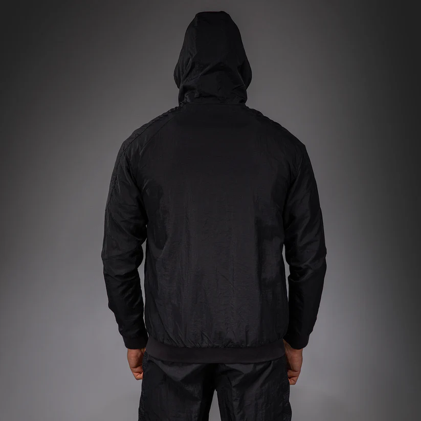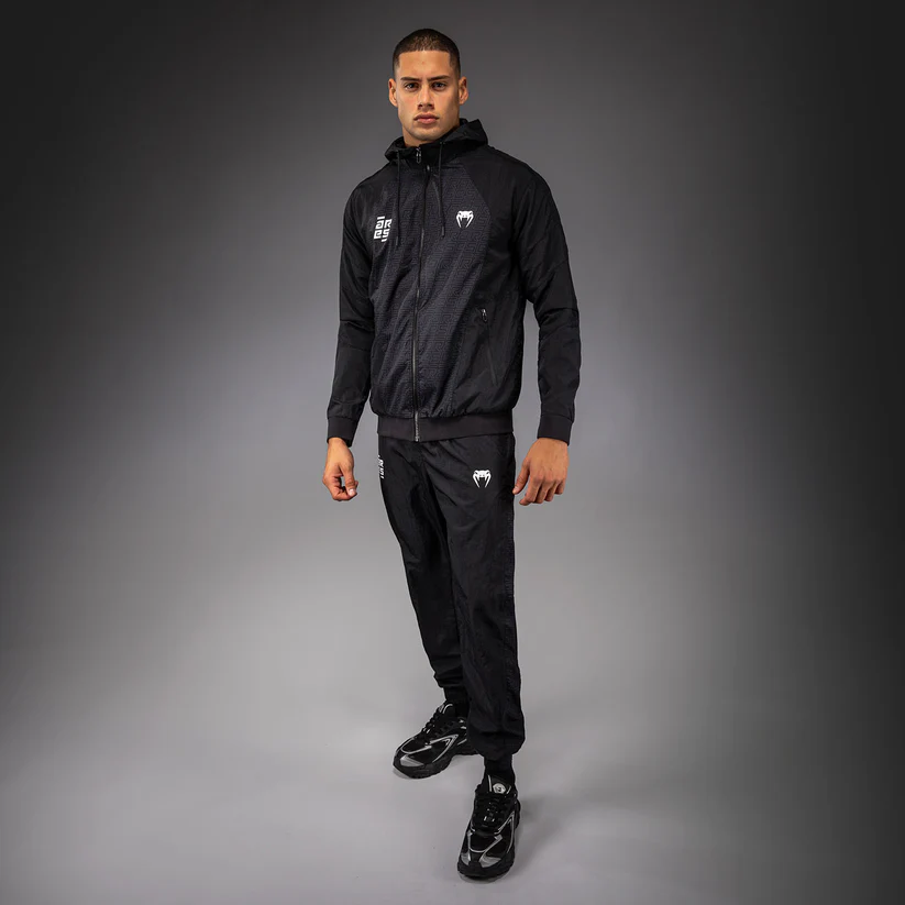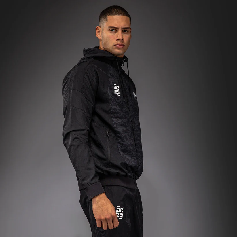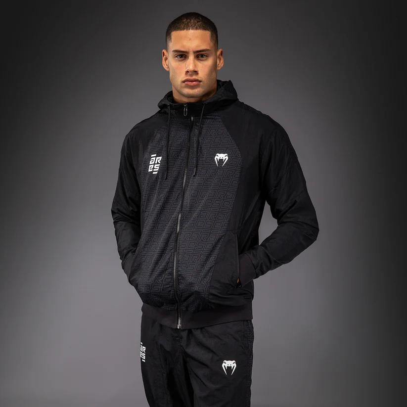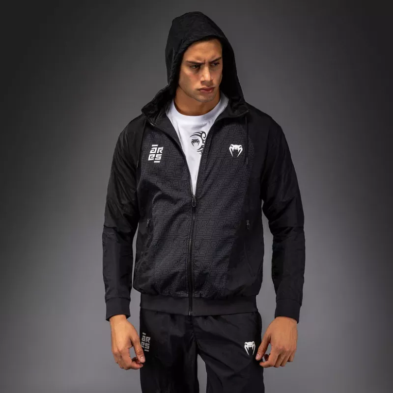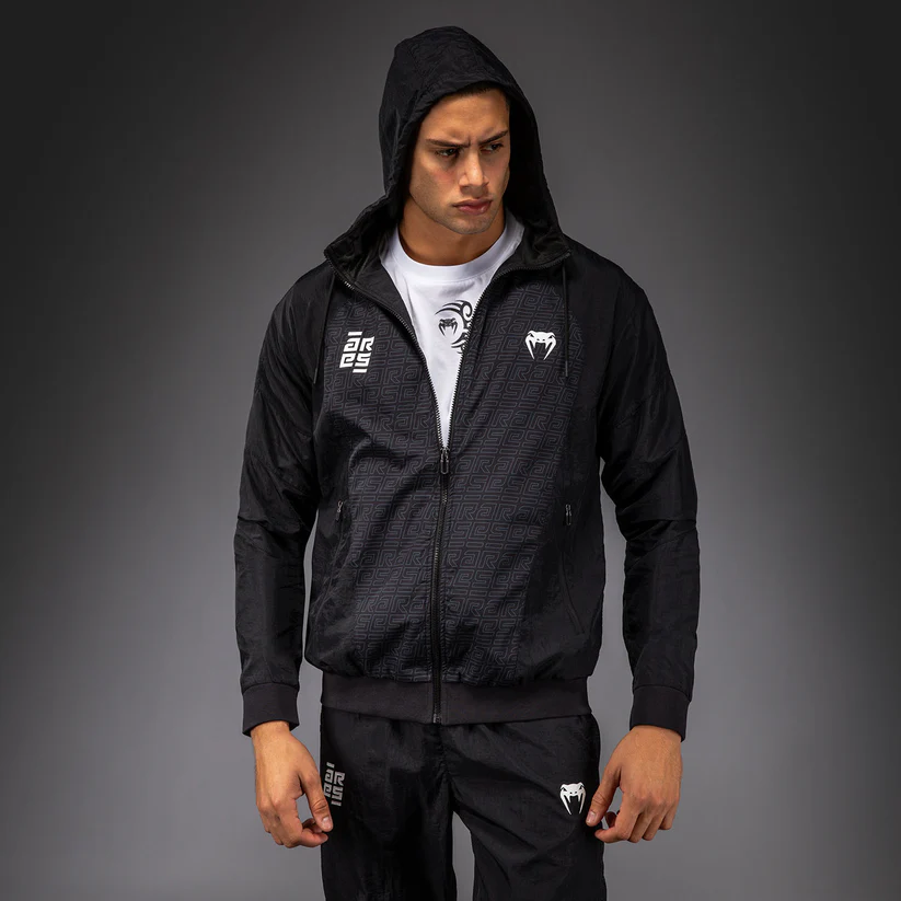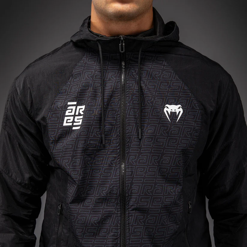 The Venum x Ares Track Jacket is a lightweight full zip jacket with zipped pockets and a drawstring hood.