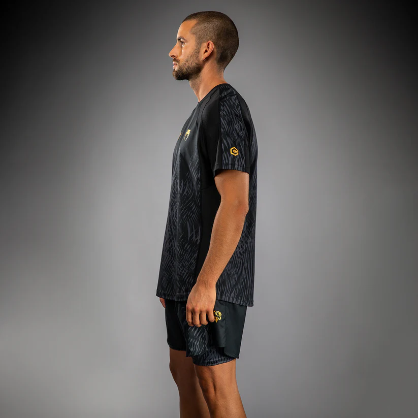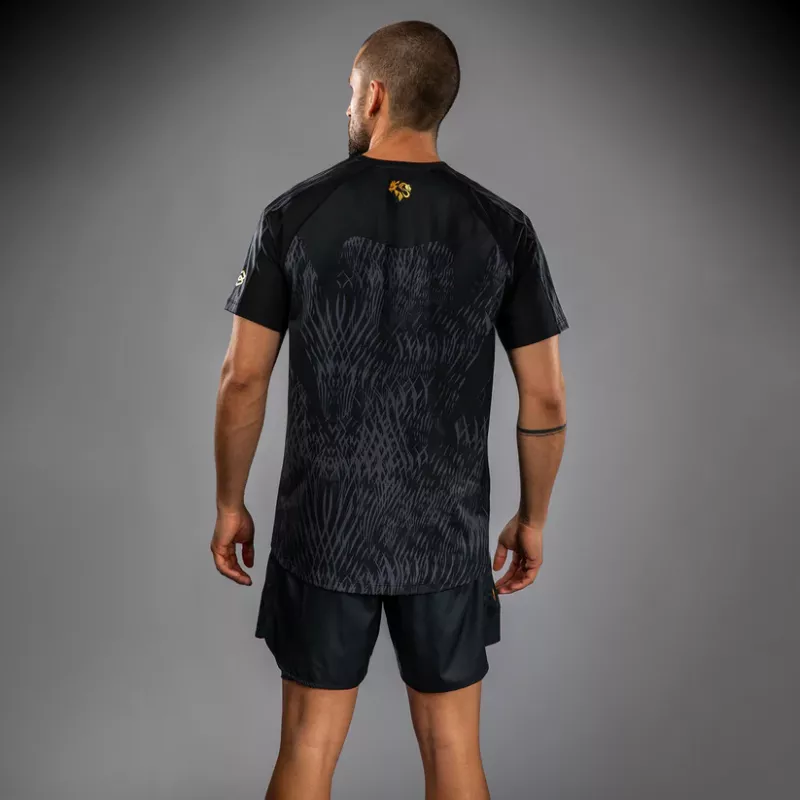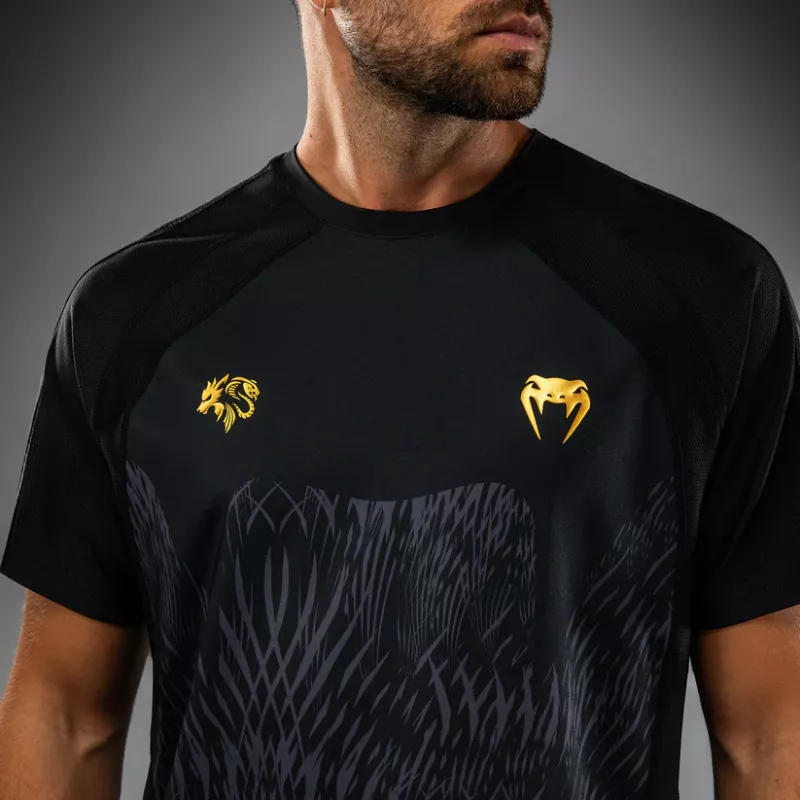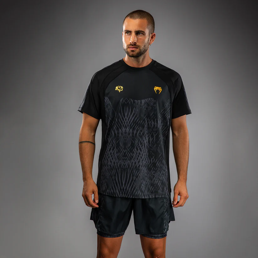 The design of this shirt features sleek black and grey sublimated graphics that evoke the fur of the wolf. Pops of gold co-branding point to the power of this MMA collaboration.