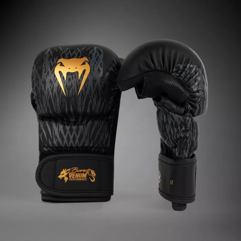 The design of these gloves features sleek black and grey graphics that evoke the fur of the wolf. Pops of gold co-branding point to the power of this MMA collaboration.