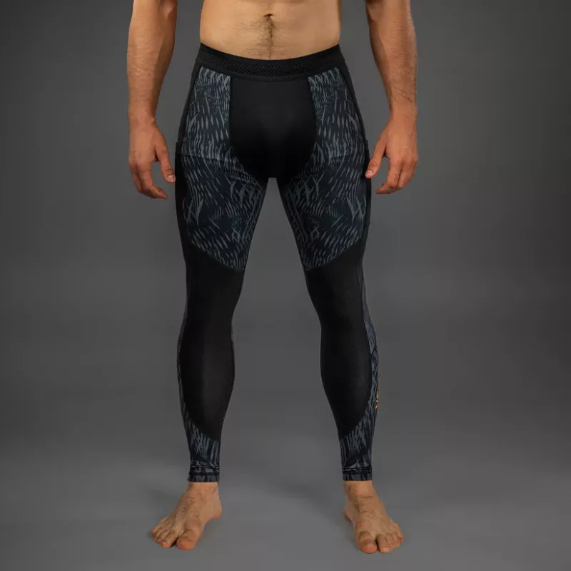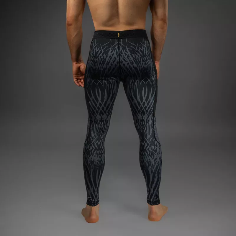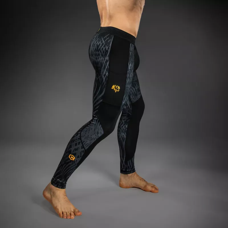 The design of these spats features sleek black and grey sublimated graphics that evoke the fur of the wolf. Pops of gold co-branding point to the power of this MMA collaboration.