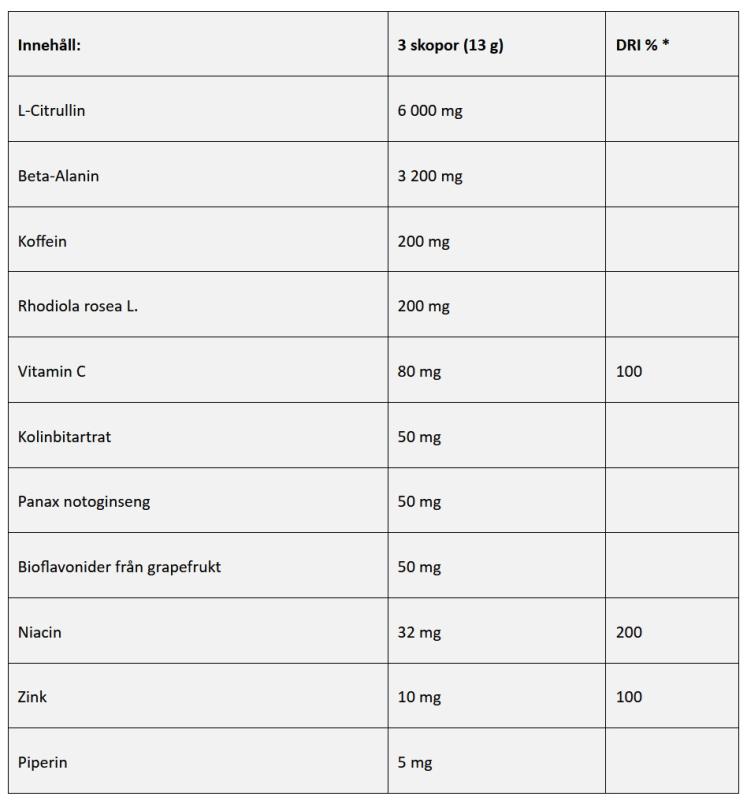 Detta är ett kosttillskott och bör ej användas som ett alternativ till en varierad kost. Den rekommenderade dagliga dosen bör ej överskridas. Förvaras oåtkomlig för små barn. Tänk på vikten av en mångsidig och balanserad kost och en hälsosam livsstil. Produkten är avsedd för friska personer över 18 år. Om Du är gravid, ammande, lider av sjukdom eller behandlas med läkemedel bör Du kontakta läkare innan Du använder produkten. Innehåller koffein. Rekommenderas ej för barn och gravida (200 mg per servering). Produkten innehåller sötningsmedel.