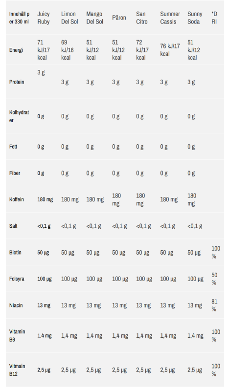 Limon Del Sol: Kolsyrat vatten, grenade aminosyror BCAA (L-leucin, L-valin, L-isoleucin), koffein, vitaminer (niacin, vitamin B6, folsyra, biotin, vitamin D, vitamin B12), surhetsreglerande medel (citronsyra), aromer, sötningsmedel (sukralos).