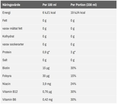 Information: Denna produkt bör ej användas som ett alternativ till en varierad kost. Förvaras oåtkomlig för små barn. Tänk på vikten av en mångsidig och balanserad kost och en hälsosam livsstil. Produkten är avsedd för friska personer över 18 år. Om Du är gravid, ammande, lider av sjukdom eller behandlas med läkemedel bör Du alltid kontakta läkare innan Du använder produkten. Hög koffeinhalt (54 mg per 100 ml)