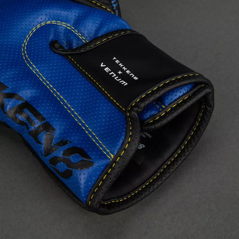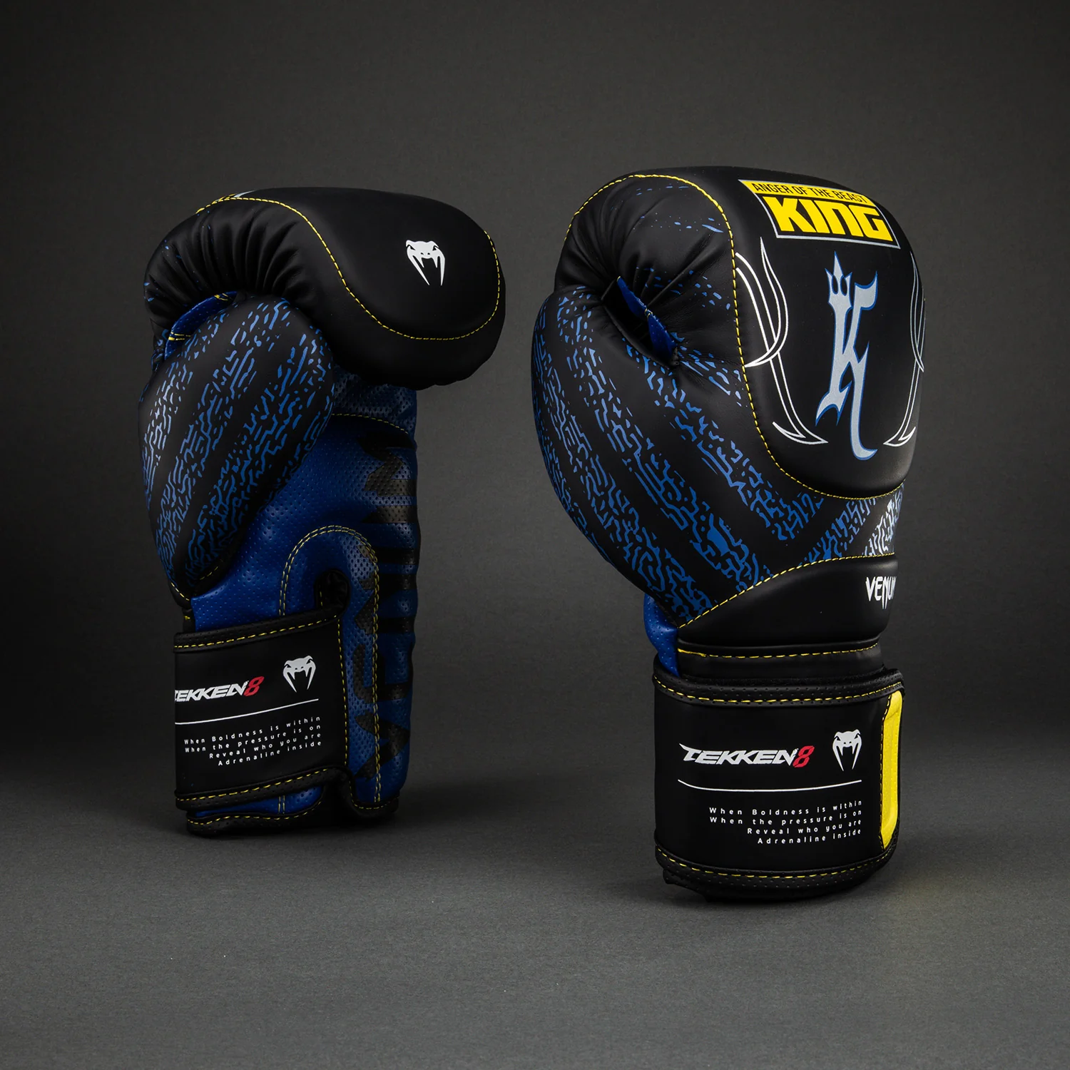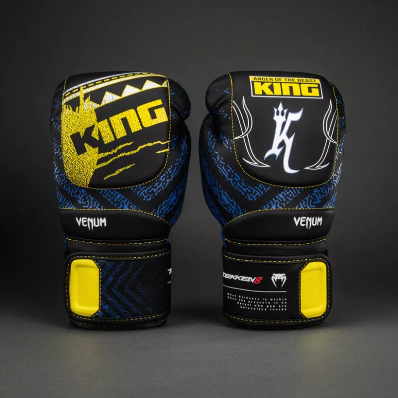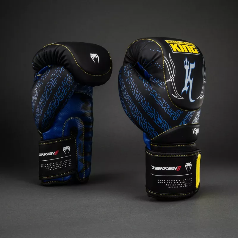 VENUM x TEKKEN 8 Boxing Gloves – King är inspirerade av Kings klassiska pro-wrestlingstil med blå, gula och svarta färger samt patch-inspirerade detaljer liknande hans wrestlingutrustning. Kron- och jaguarmotiven refererar direkt till hans ikoniska mask och karaktär.